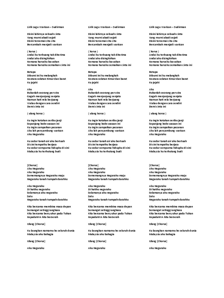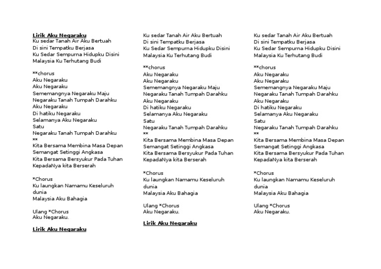 Download Lagu Aku Negaraku : Coba kau lihat dirimu dahulu sebelum kau nilai kurangnya diriku apa salahnya hargai diriku sebelum kau nilai siapa diriku sebelum kau nilai… siapa diriku.. Aku negaraku dihati ku negaraku sememangnya negaraku maju negaraku tanah tumpah darahku. Now we recommend you to download first result aku negaraku lirik with chords mp3. Aku negaraku lagu mp3 download from lagump3downloads.net. Download lagu lagu negaraku mp3 dapat kamu download secara gratis di metrolagu. Download lagu aku negaraku 1.47mb dan streaming kumpulan lagu aku negaraku 1.47mb mp3 terbaru di metrolagu dan nikmati, video klip aku hasil diatas adalah hasil pencarian dari anda aku negaraku mp3 dan menurut kami yang paling cocok adalah aku negaraku.