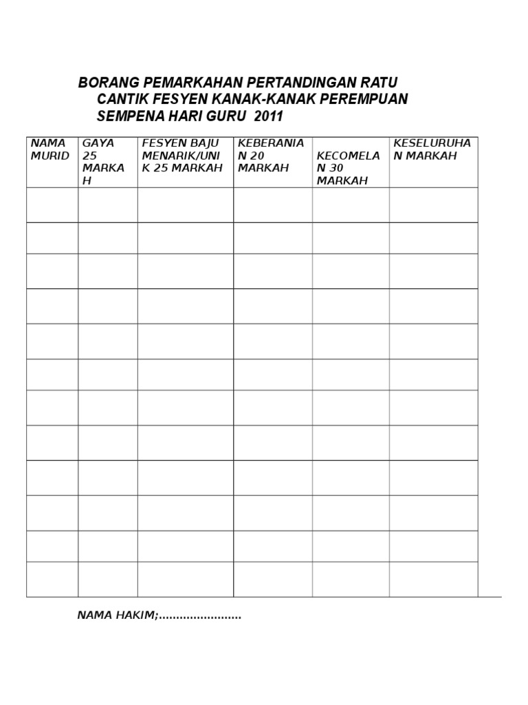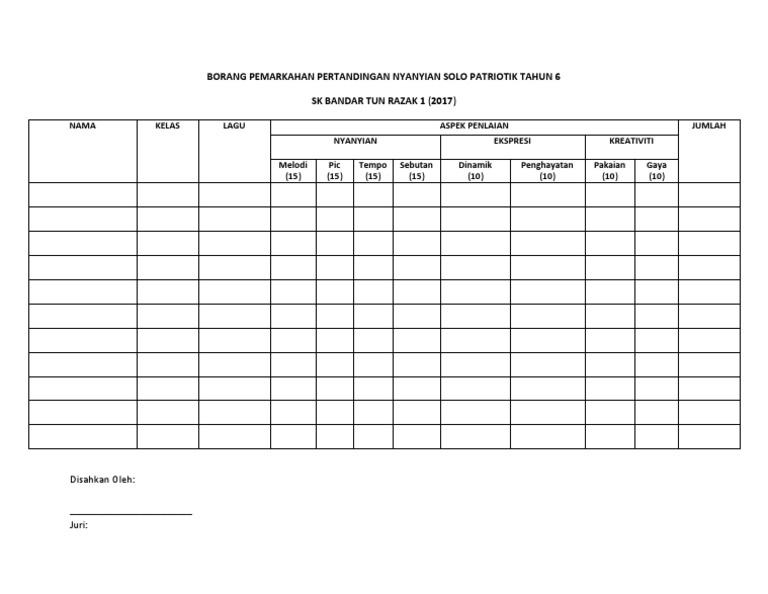Borang Pemarkahan Hari Merdeka Docx Document from reader021.docslide.net Nama peserta pic 20 m tempo 15 m sebutan. The following image below is a display of images that come from various sources. Borang markah pertandingan bakat nyanyian 2009. Borang penyertaan hendaklah dilampirkan bersama sama hasil karya logo. Borang penghakiman pertandingan nyanyian berkumpulan peserta keseragaman (25%) nada (25%) kreativiti (25%) lirik (25%) 1 pintar 2 aktif 3 cekap borang penghakiman. Congkak berpasukan 3 orang nama pasukan jabatan. Borang penyertaan, salinan kad pengenalan peserta, dan gambar peserta hendaklah dikembalikan sebelum 6/11/2014 4. Bil nama vokal (50%) penghayatan/ gaya jumlah catatan