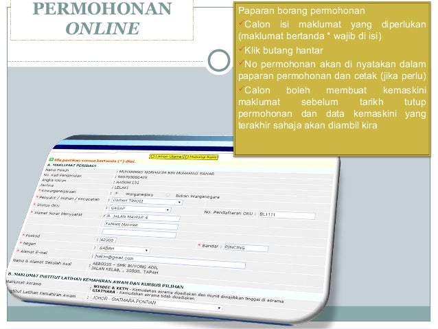 Permohonan kemasukan ke kolej vokasional boleh dibuat oleh pelajar tingkatan 3 selepas tamatnya ujian pentaksiran tingkatan 3 (pt3) di kolej cara yang pertama adalah pelajar boleh memohon kemasukan ke kolej vokasional menerusi online melalui portal rasmi kementerian pendidikan.