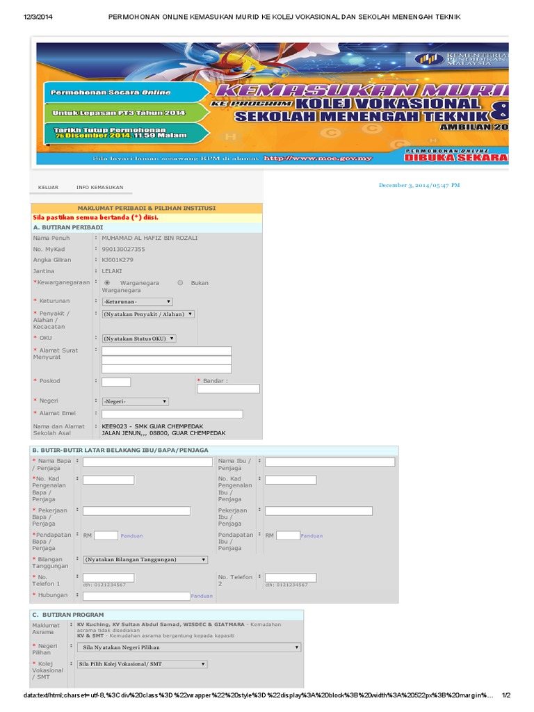 Permohonan kolej vokasional (kv) bagi ambilan januari 2020 telah pun dibuka. Borang permohonan kemasukan ke kolej vokasional dan sekolah menengah teknik. .untuk kemasukan ke sekolah berasrama penuh (sbp), sekolah menengah kebangsaan agama (smka), sekolah menengah teknik (smt) dan kolej 352 thoughts on permohonan kemasukan ke sekolah menengah teknik (smt) dan kolej vokasional (kv) tahun 2021. Berikut adalah syarat permohonan untuk kemasukan ke kolej vokasional dan sekolah teknik. Permohonan kemasukan tingkatan 4 sekolah menengah teknik & kolej vokasional pengambilan tahun 2014 telah dibuka untuk pelajar tingkatan 3 pmr 2013.